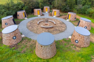 Exclusive use of our stunning fully insulated and heated wooden camping pods set in a meadow around a campfire. The Lodge provides toilets, showers, and dining area with bifold doors to eat indoors or al fresco.